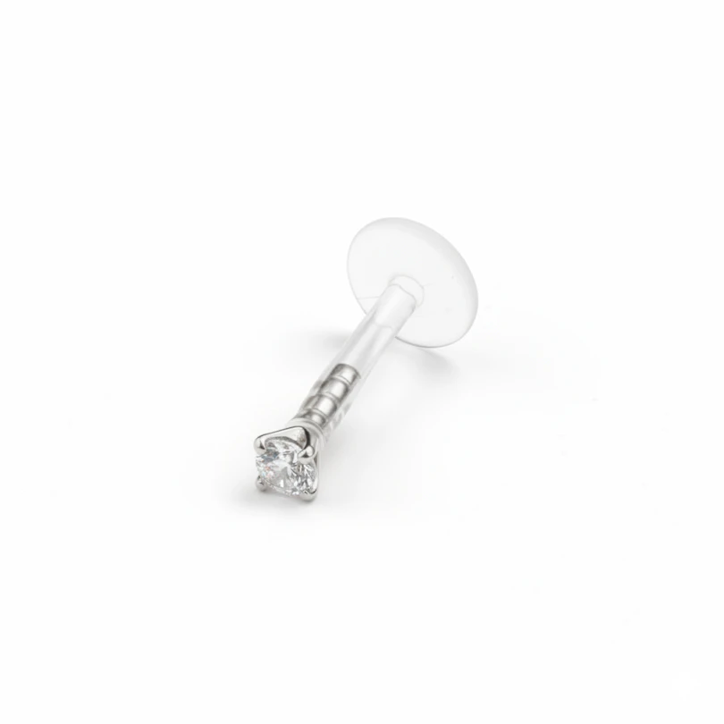 The top of the labret is made of exclusive 14 karat gold. You can find this labret stud in three different gold types: white gold, rose gold, and yellow gold. All the models feature a facet cut clear top stone. This stone is commonly used to resemble a diamond, as it reflects light in its small facets. It sheds it back to give a very bright appearance and thus gets extra attention. You can also choose the stone size, depending on how noticed you want to be ;)