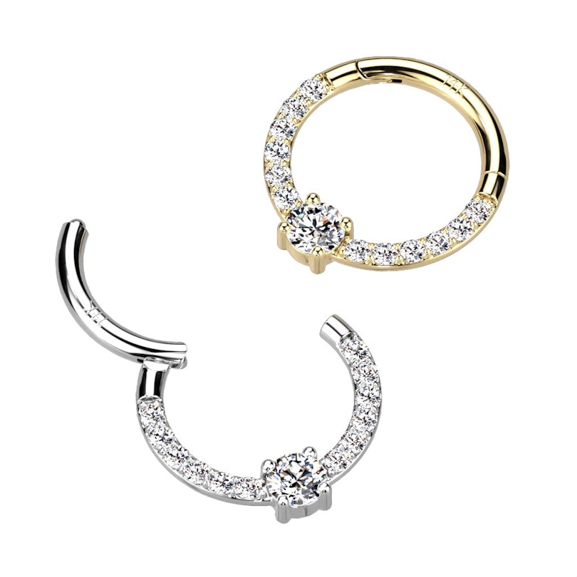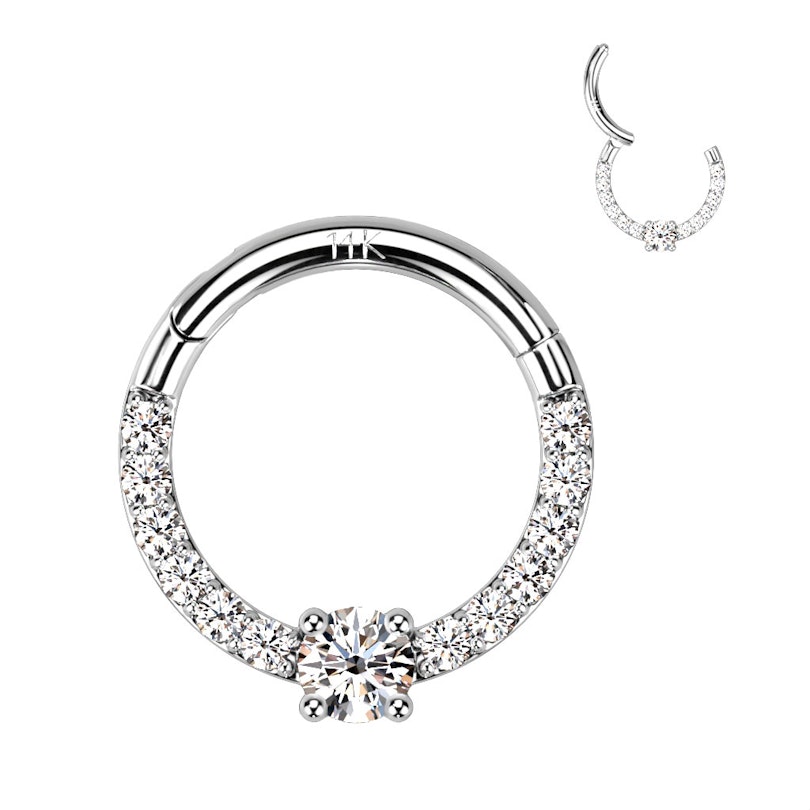 There is plenty of sparkle on this elegant 14K gold ring featuring a prong-set center stone and stone-paved sides. Clear CZ stones adorn the front of the ring, making it a real eye-catching piece for your septum or ear piercings, like helix or daith. The ring comes in stylish white gold and classic yellow gold variations, and you can choose between 8 mm or 10 mm ring diameters.