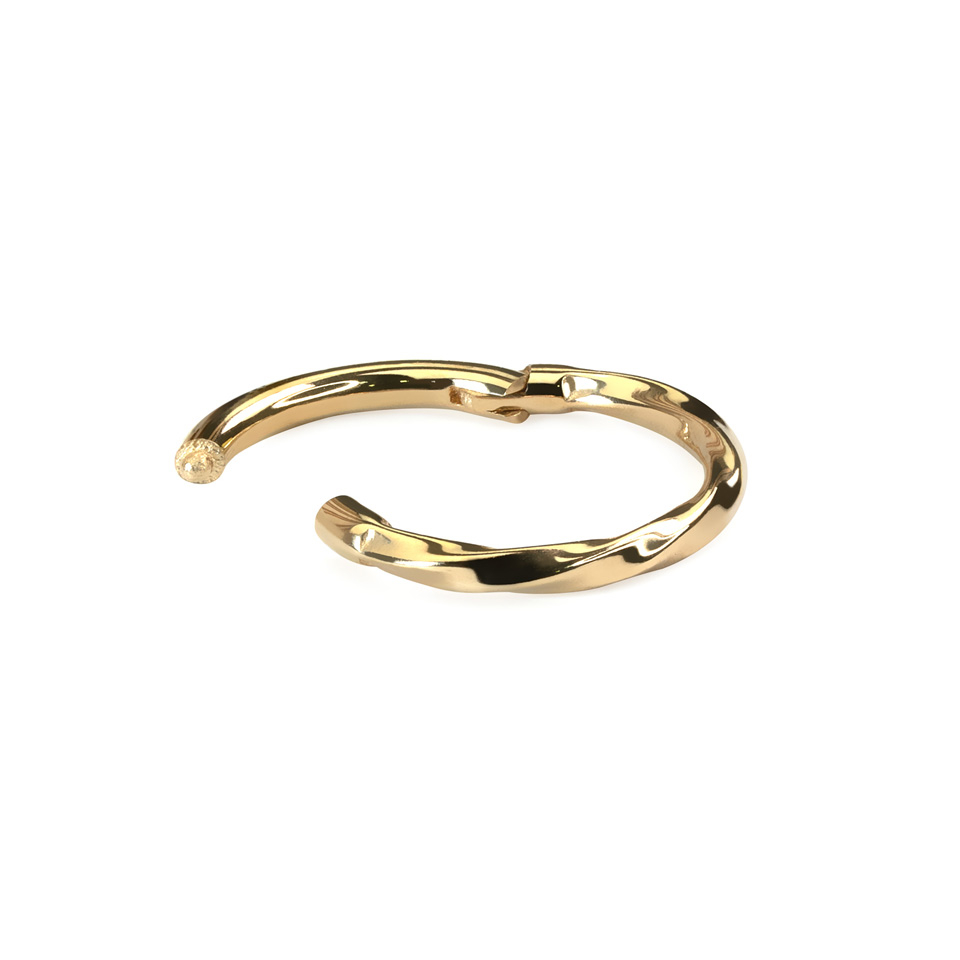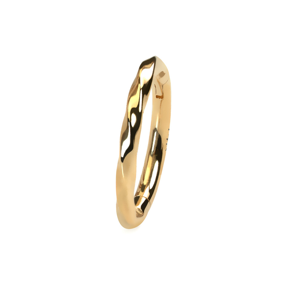 Šis dailus vyriais užsegamas žiedinis auskaras pagamintas iš 14k aukso. Dėl subtiliai sukto dizaino šis nesenstantis papuošalas atrodo įdomiai. Žiedas puikiai tinka įvairiose ausies auskarų vėrimo vietose, pavyzdžiui, ausies kaušelyje, taip pat jį galima segėti kaip helix, tragus, daith ir rook auskarą. Šį iš mados neišeinantį papuošalą galima nešioti kasdien. Dėl vyrių užsegimo įsiverti lengva, o nešioti patogu.