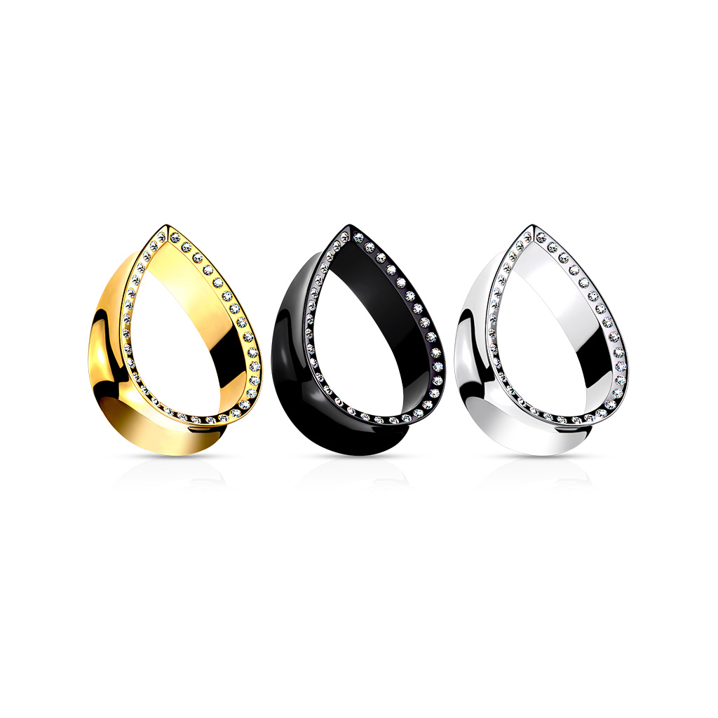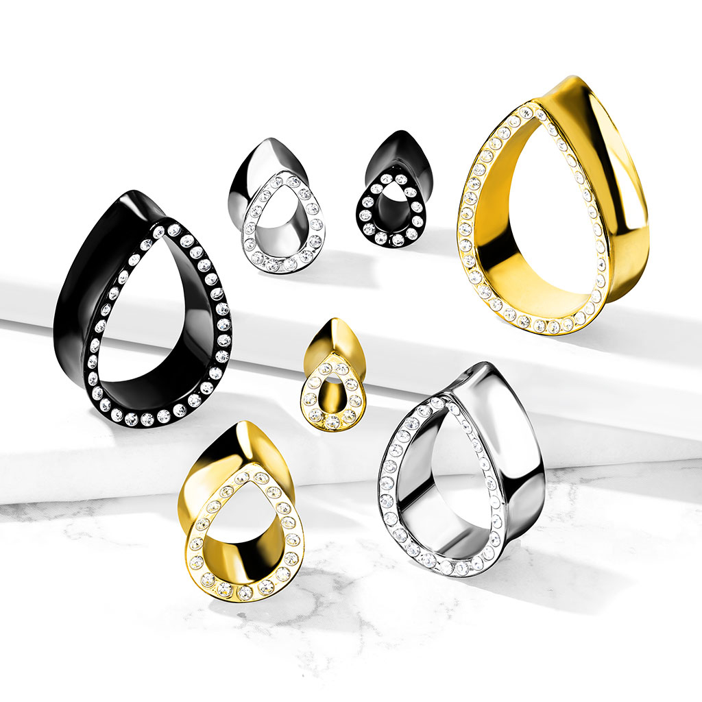 The vast majority of tunnels are round. This tunnel is teardrop-shaped -- or pear-shaped if you like. It's available in three beautiful colors, which you can see in the picture. Common to all the models is that they come with small clear stones around the edge. It's clear that the larger the diameter of the tunnel, the more stones there will be around the edge.