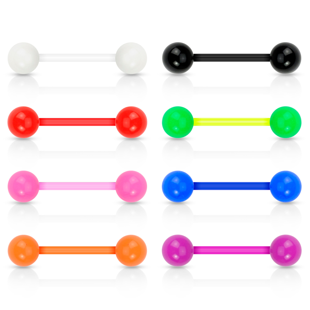 This set contains 8 tongue barbells, each in a different color, and all of them are made of PTFE or bioplastic. PTFE is a very soft and flexible plastic material that has many advantages. It's comfortable to use, mainly thanks to its flexibility, so you won't even notice it in your tongue. If you receive an impact in your mouth, this will bend as well. Our tongue is a muscle we use all day long, so wearing a barbell of this material is an excellent idea.