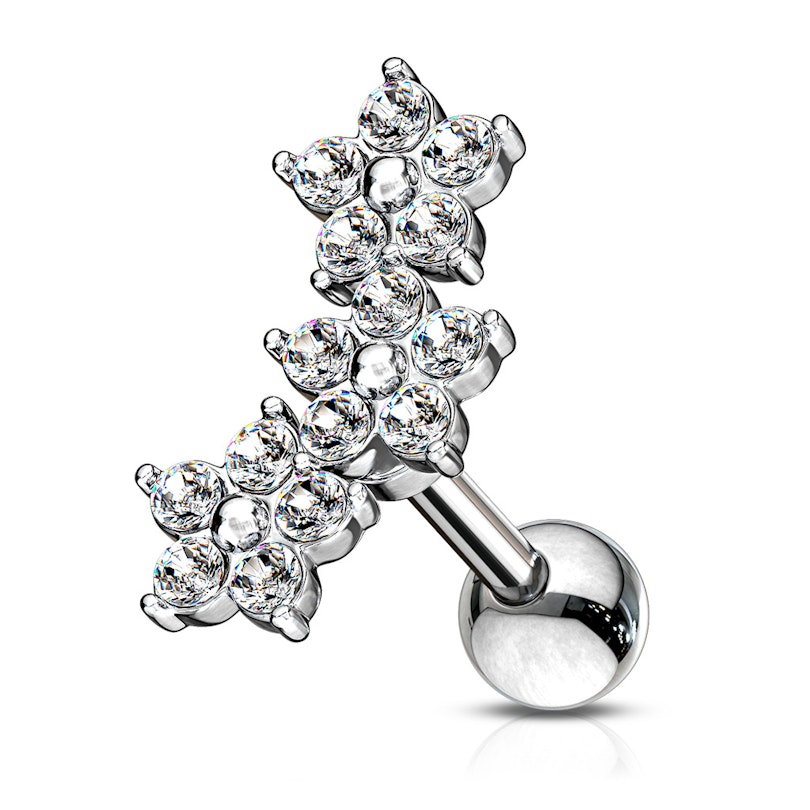 This piercing jewelry is perfect for the helix, as you can see in the picture of the model above. The three flowers in the front create a subtle arch that follows the shape of the ear's edge. The flower cluster measures approximately 1/2" (12 mm) from top to bottom, which consists of three little five-petal flowers. The flowers are available in three different colors. All three models are the same except for the color of the flowers.