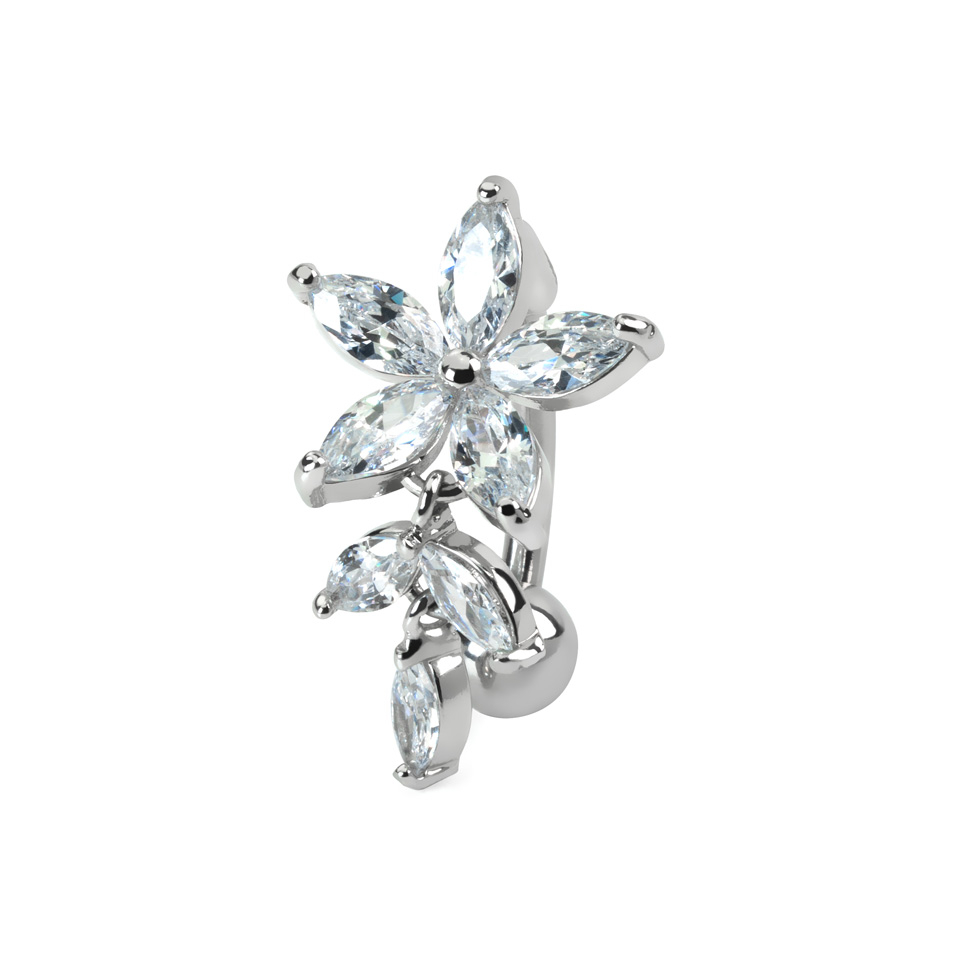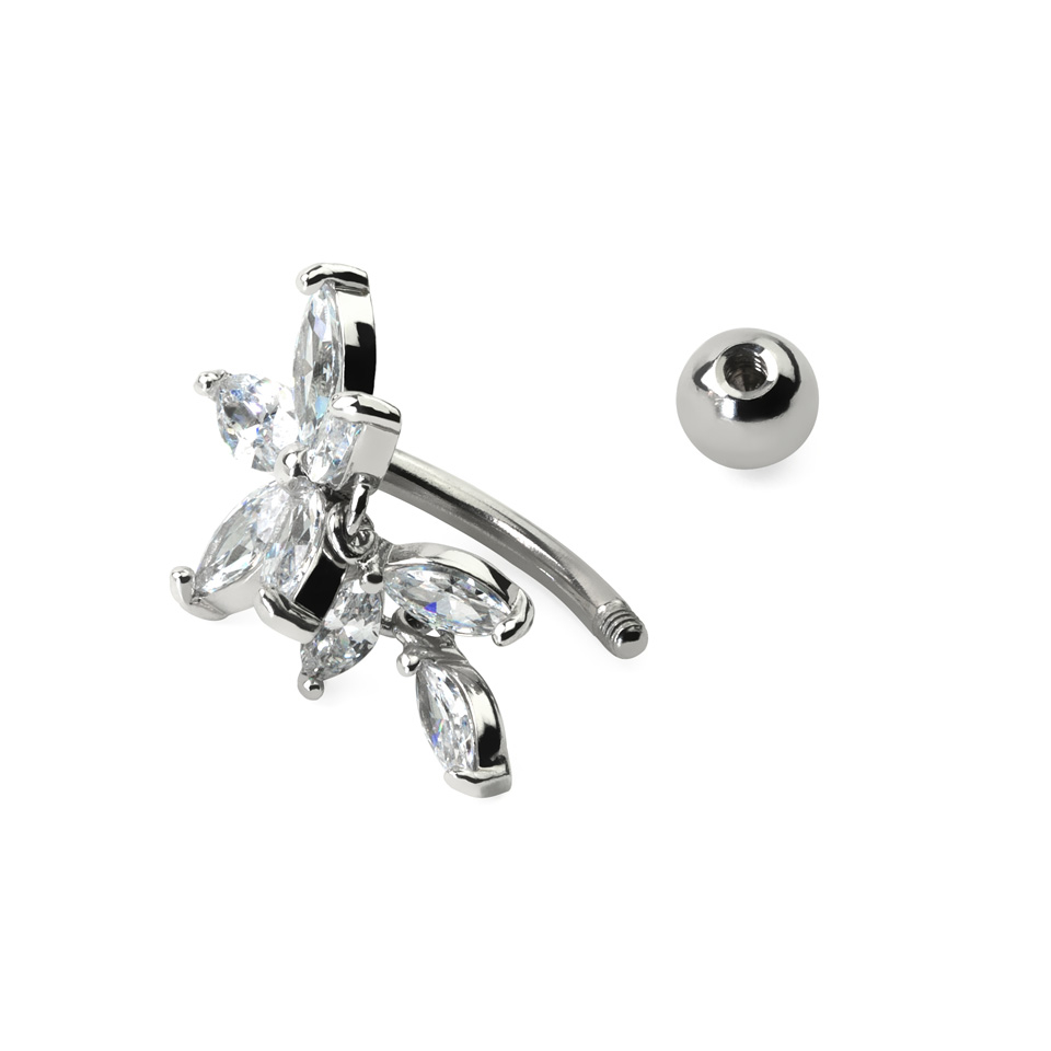 The curved barbell and the bottom ball are made of surgical steel, and the metal of the flower is crafted from brass. It has subsequently been given a rhodium coating in the same color as the surface in surgical steel.