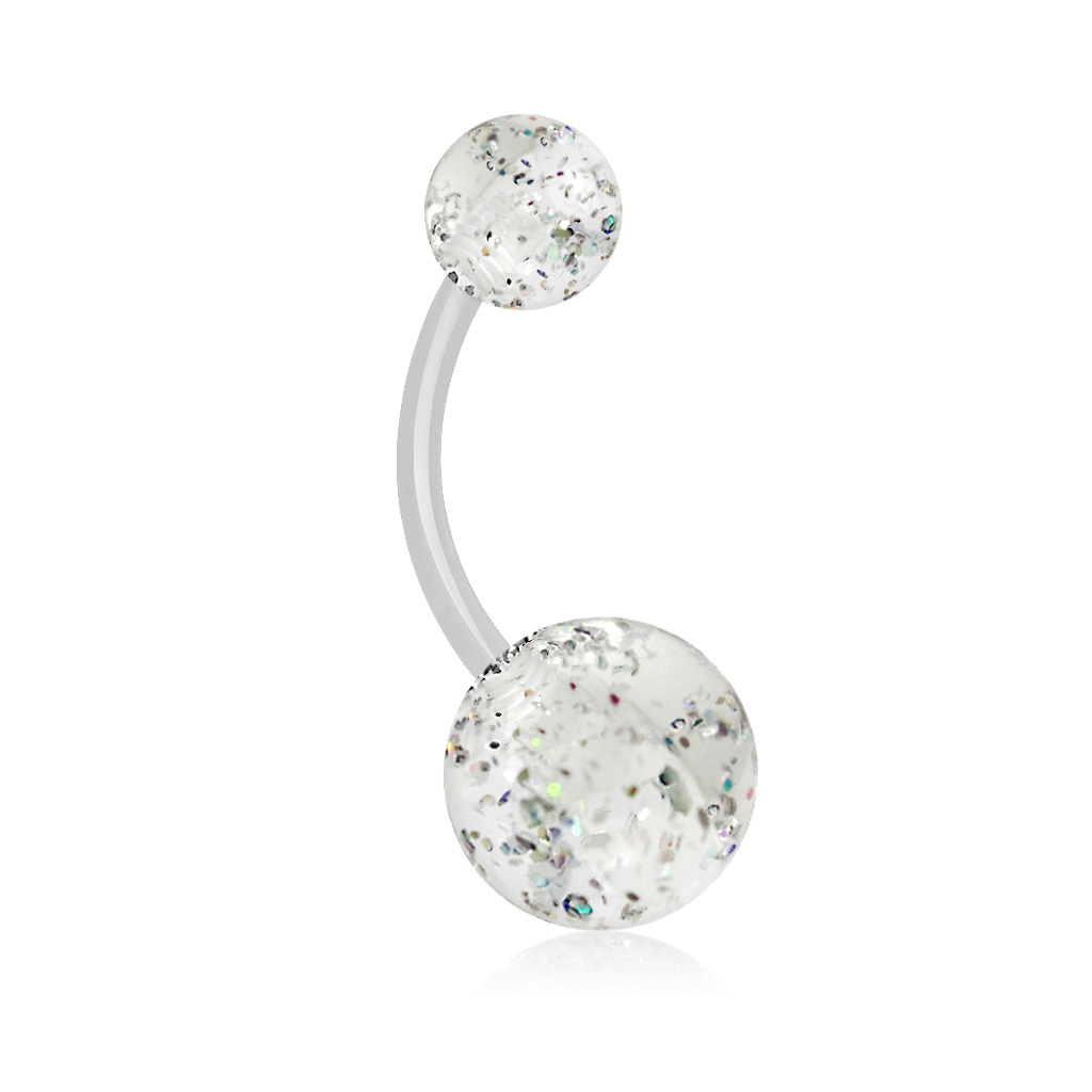 The balls of the barbell are semi-transparent, with glitter flakes that make it look irresistible.