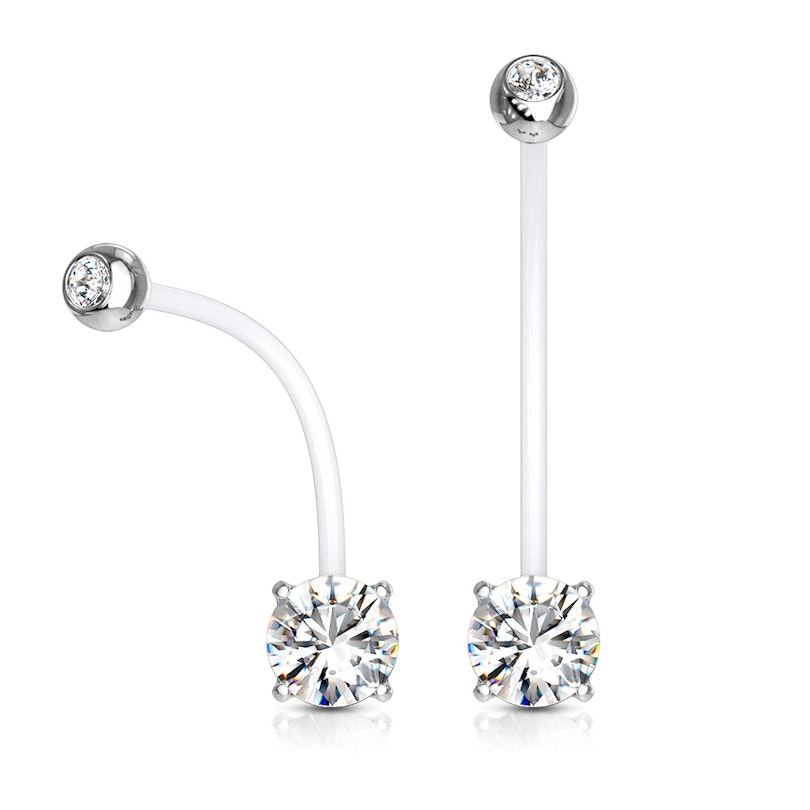 This belly ring is made of a soft plastic material called PTFE, which can bend quite a lot. This means it will follow your body's moves and adapt to your growing tummy during pregnancy.
