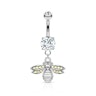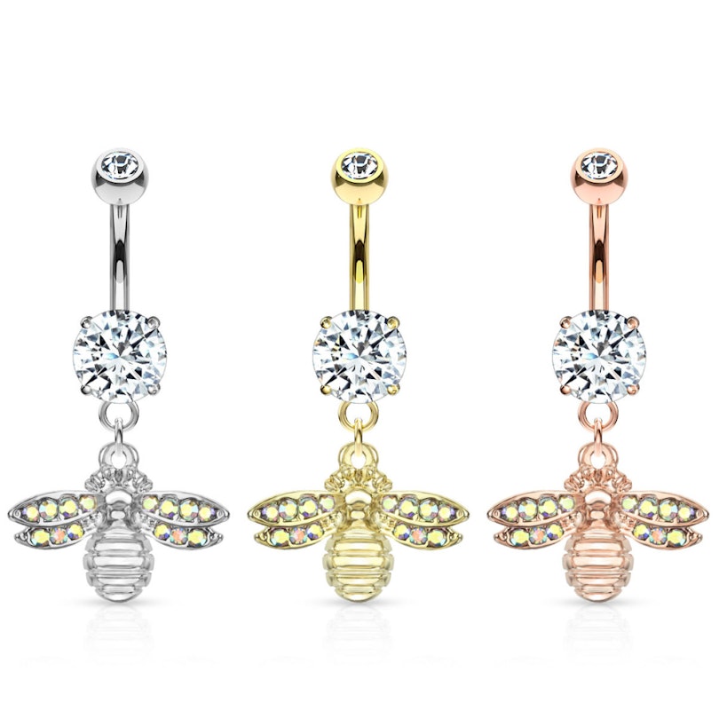 The belly button ring you see above features a cute little bee hanging on the pendant. The bee is crafted from brass, and its wings include several tiny stones that reflect most colors of the rainbow. We call it aurora borealis, as it reminds of the northern lights. The bee hangs from a 3/8" (10 mm) long curved bar with a gauge of 14g (1.6 mm). It's made of surgical steel, just like most other belly rings that you will find at the store.
