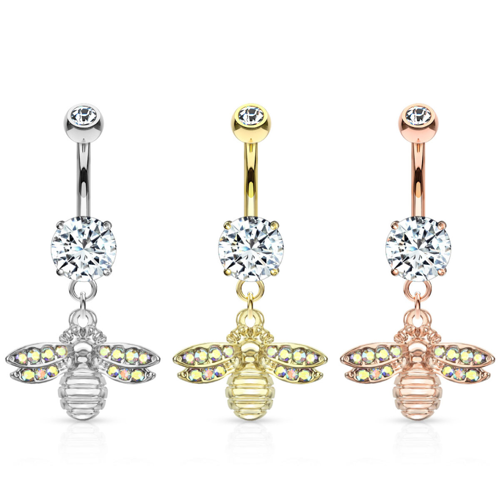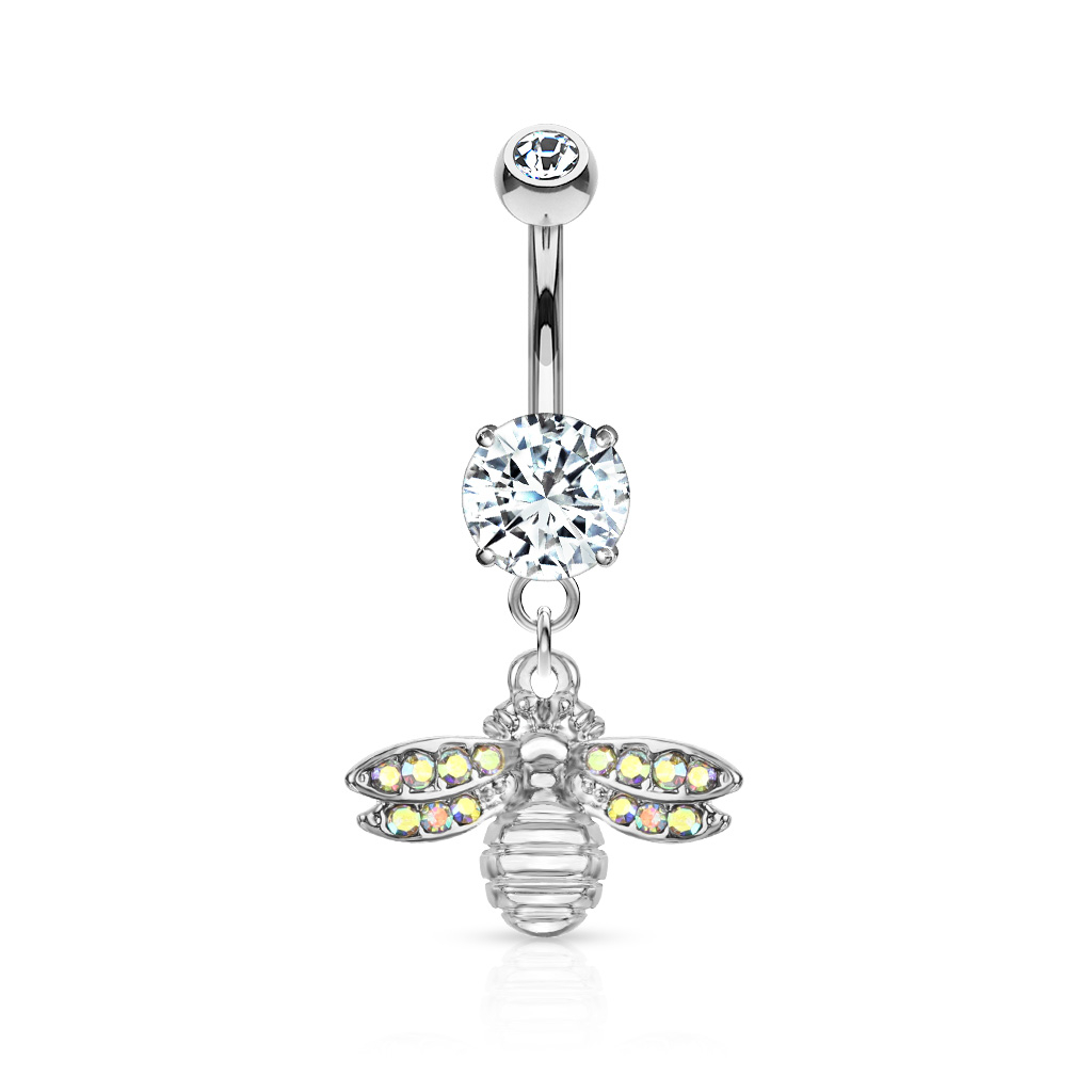 The belly button ring you see above features a cute little bee hanging on the pendant. The bee is crafted from brass, and its wings include several tiny stones that reflect most colors of the rainbow. We call it aurora borealis, as it reminds of the northern lights. The bee hangs from a 3/8" (10 mm) long curved bar with a gauge of 14g (1.6 mm). It's made of surgical steel, just like most other belly rings that you will find at the store.