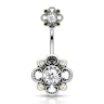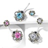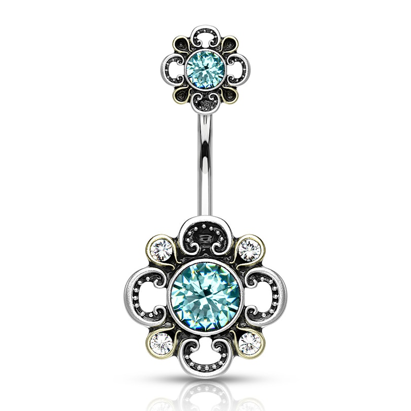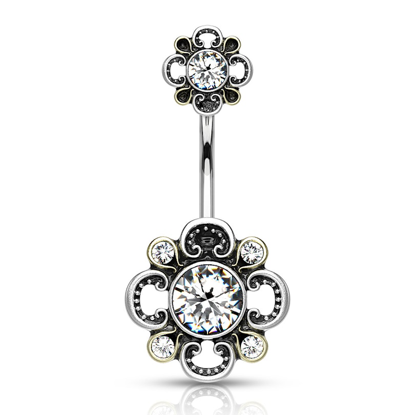 The curved barbell is made of surgical steel, while the flowers are crafted from brass. These are layered with an antique silver coating and carved in a filigree design.