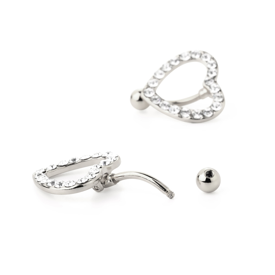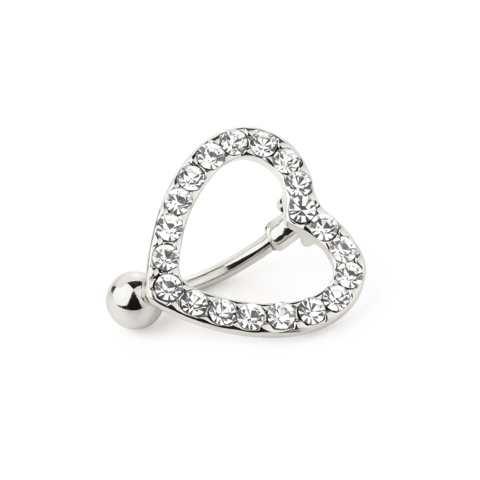 This barbell is made of surgical steel. The large edge of the heart is inlaid with many stones, fixed on the structure by tiny prongs.