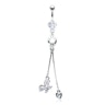 This is a new belly ring with long chains and beautiful details with clear stones. The dangle has a beautiful heart with transparent gems at the top, and behind it, there's a beautiful ring. Two separate chains hang from the ring. The fact that they are separate means that they will move with your body's movements.