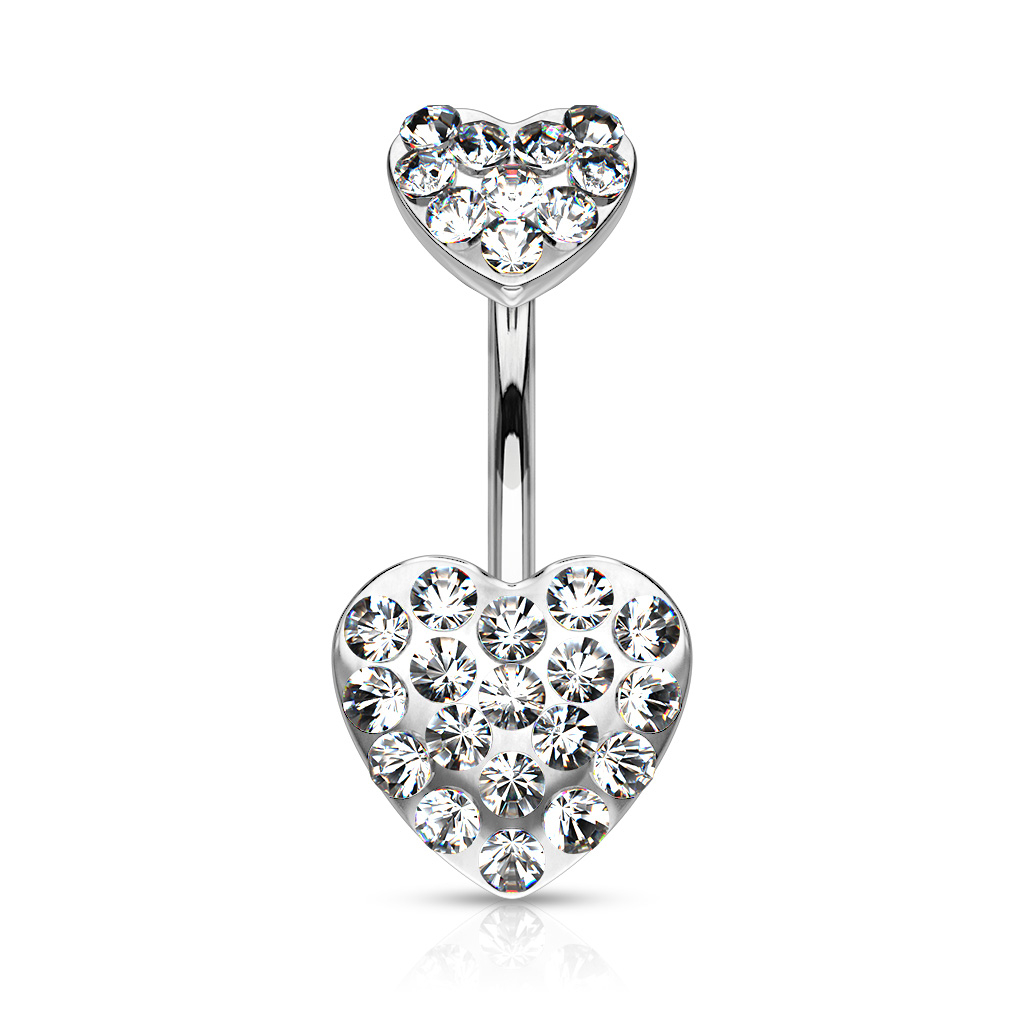 It's made of surgical steel and has a barbell length of 3/8" (10 mm). Instead of the classic top and bottom balls, it has two beautiful hearts studded with lots of stones, which is the feature that stands out the most. These tiny stones resemble diamond cuts which allow light to reflect on them from many different angles. You can choose between five different models for this belly ring, all of them in spectacular colors.