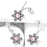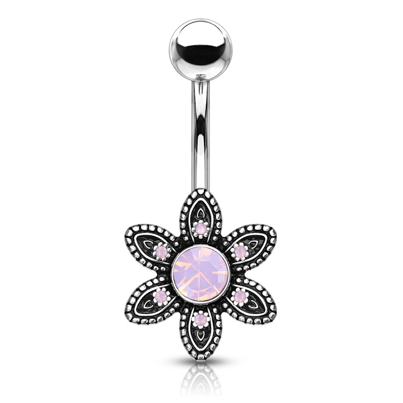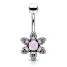 The opals you can see in the picture are synthetic opal stones. However, this doesn't affect the beauty of the stones, as you won't be able to notice the difference from real gems. There's a total of seven opalites in this belly ring: a small opal on each of the flower's petals, and a big one in the middle. All the featured stones are round and pink. The small stones are held by tiny brass chunks, while the big opal is glued to the center of the flower and framed with a brass ring.