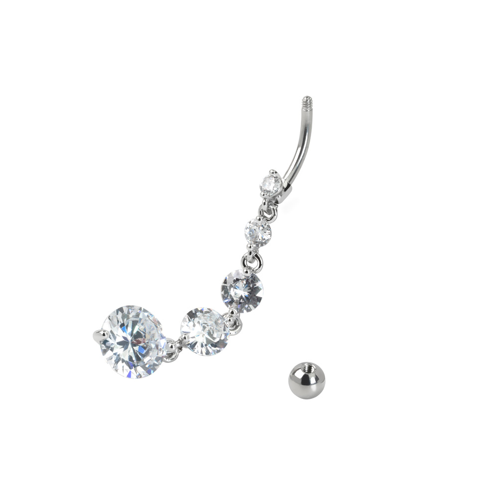 The barbell is 3/8" (10 mm) long and made of surgical steel, a safe material that is the most widely used in body piercing jewelry. While it has a standard top ball, a beautiful dangle hangs from the bottom ball, with stones in the color of your choice.