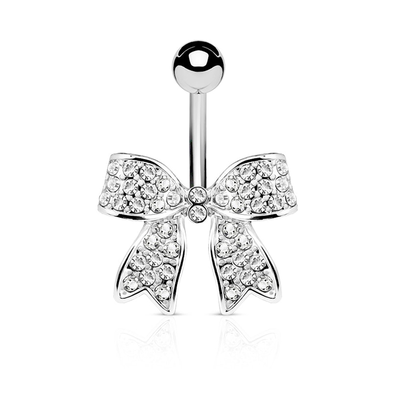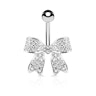 This charming belly ring is in the shape of a ribbon tied in a bow. The stem and ball are made from surgical steel, and the bow is made from brass. The bow is studded with delicate CZ stones, with two large stones at the centre. It has an external thread meaning that to secure it in your piercing you simply screw the small ball onto the stem. This charming piece is a fun addition to your collection of piercing jewelry.