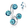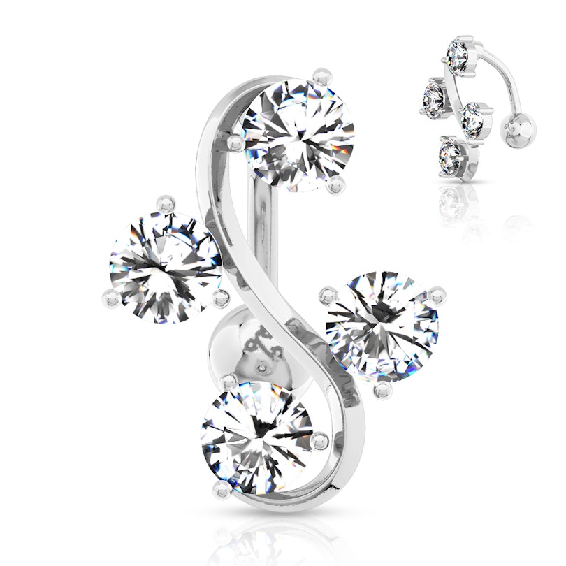 This is an original and lovely belly button ring with four staggered stones in an S-shape. It will look amazing when light reflects on them because its design allows us to see the skin behind the ring. It's made of surgical steel, the most widely used material in body piercing jewelry. It doesn't release nickel particles, and it's incredibly resistant.