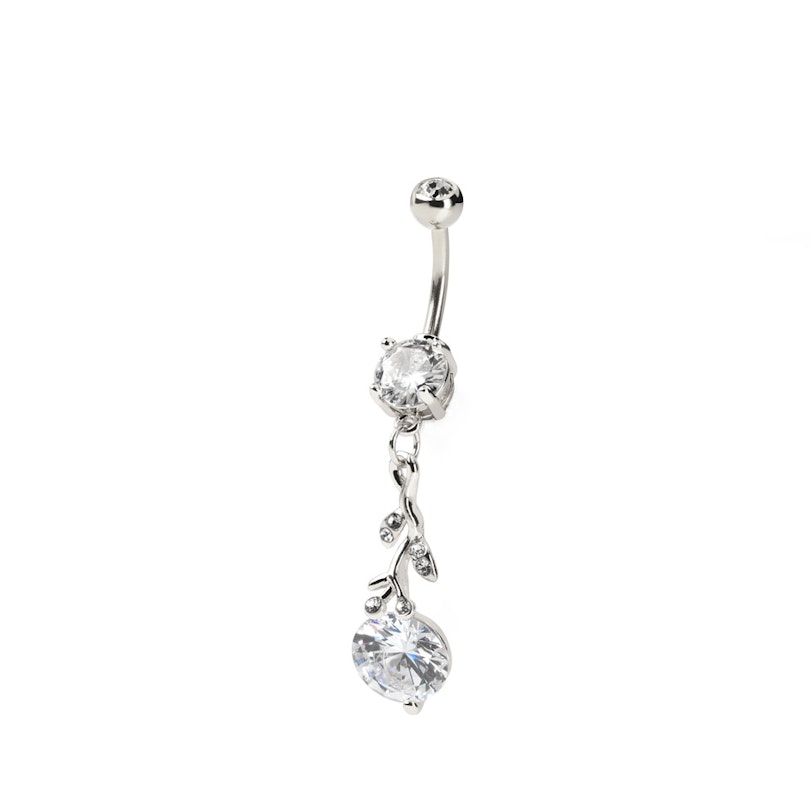 This belly button ring features a dangle with tree branches and some leaves. The splendid branch and its studded leaves bring this ring to life. At the bottom of the dangle, there is a large cubic zirconia stone - apart from this one, there is a bezel-set top ball, a large round dangle stone, and small gem leaves. You can certainly say this piece spares no zirconia stones. Both stones in the curved barbell's bottom ball and the dangle have a four-prong setting, which holds the stones in place, ensuring they don't fall out.