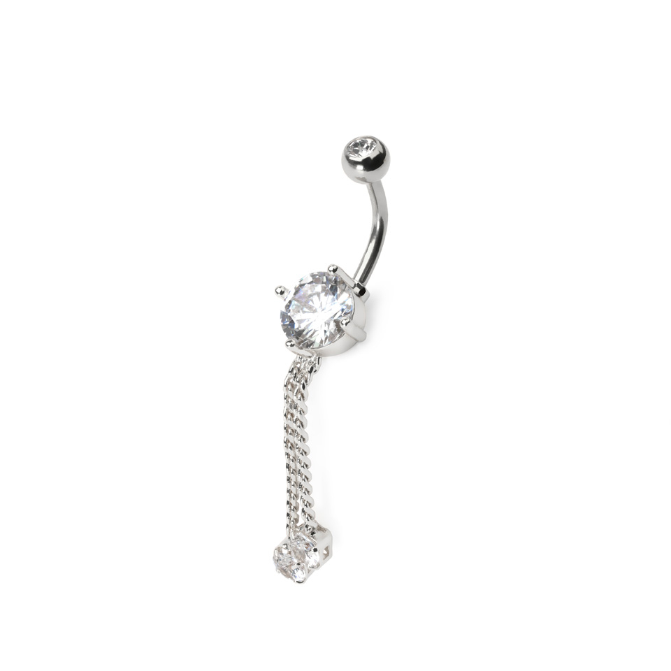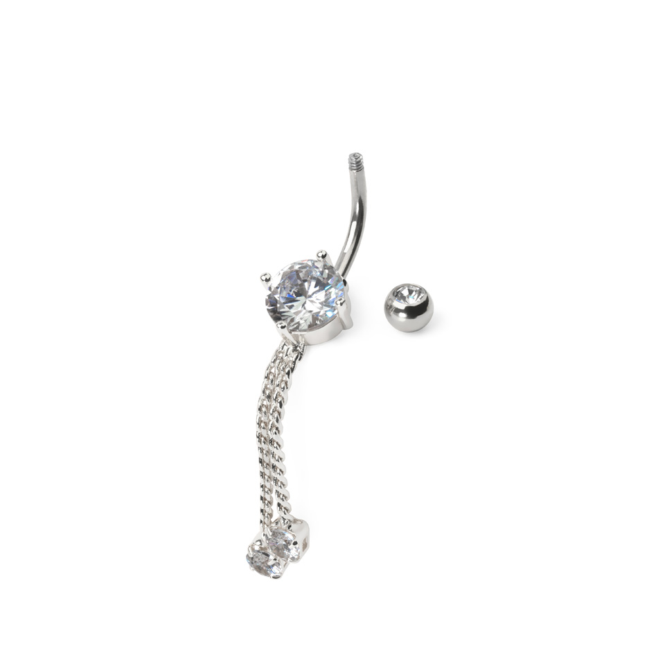 This beautiful belly ring is a true statement piece. The chain dangles finished with small stones add a touch of elegance and movement, making this belly ring truly unique. Being made from surgical steel ensures durability and comfort. The bar is 10mm (3/8") long with a thread thickness of 1.6 mm. The chains drop 28 mm from the main stone. Available in a choice of gold, silver, and rose gold finishes with clear stones. This belly button ring is the perfect accessory for adding sparkle to your look.