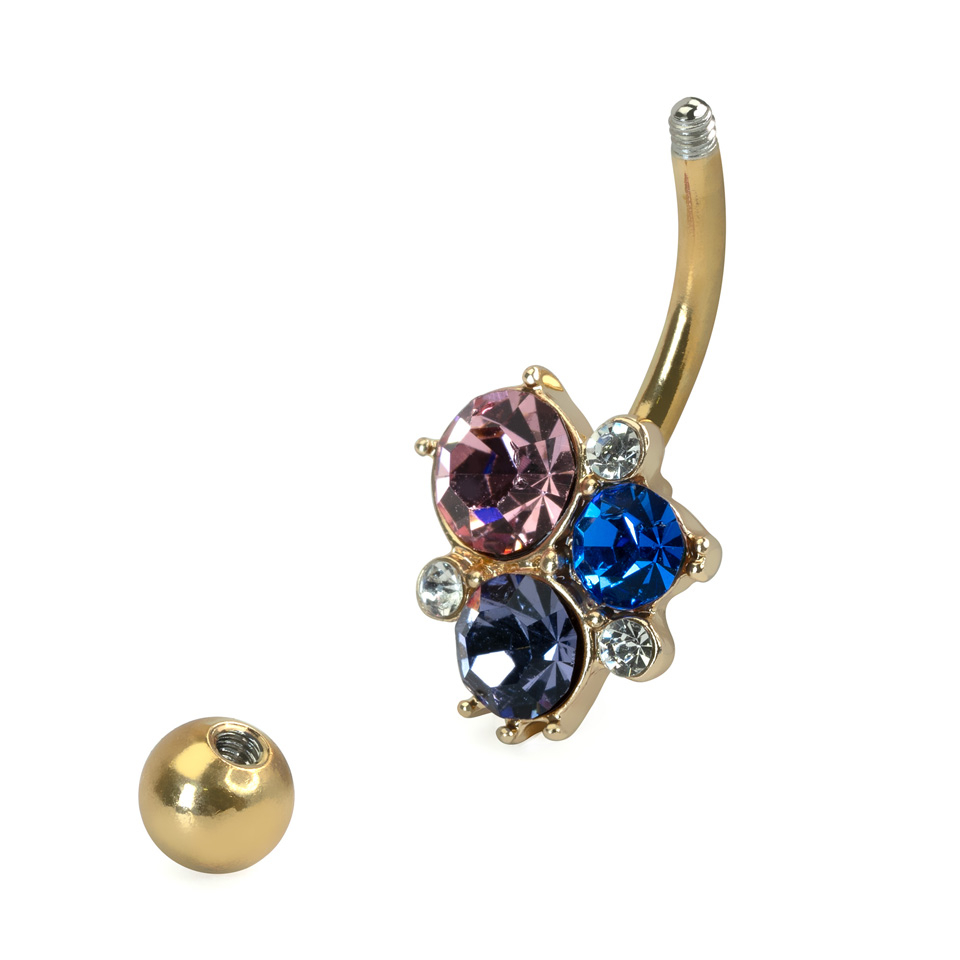 This surgical steel belly ring features a 5 mm ball at the top and a cluster of different colored prong-set crystals in complementary colors at the bottom.