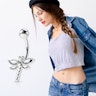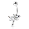 This small dragonfly has two wings on each side, in oblong-shaped gems, and one more gem on the head, in a round shape. The dragonfly is slightly tilted according to the barbell, giving the belly ring a natural and charming appearance.