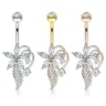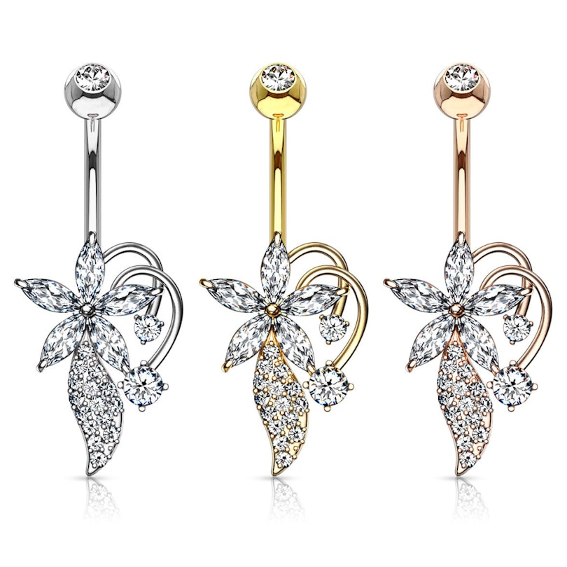 This belly button ring comes in a simple design with a curved barbell and a top ball, with a decorative flower and a creeper at the bottom. The belly ring has the standard dimensions of belly button rings: a bar gauge of 14g (1.6 mm) and a length of 3/8" (10 mm). The curved barbell and the ball are made of surgical steel, while the rest is crafted from brass. The parts have subsequently been plated with gold - or with rhodium in the case of the beautiful silver color model.