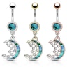 In the picture above, you can see one of the most mysterious belly button rings. The dangle features meanings and symbols from different faiths around the world. There is a crescent moon dangle with some stars. For example, a crescent moon means growth and creativity in the Celtic belief. The moon and the bottom ball have been decorated with mother of pearl or nacre, which has a calming effect on the person carrying it. Mother of pearl is a natural material found in the inner layer of a pearl mussel, often used in the making of jewelry.