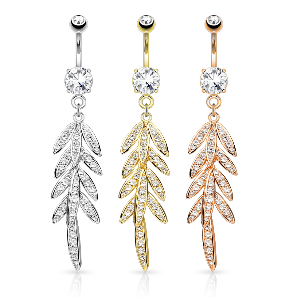This is a beautiful and elegant belly button ring with a palm leaf dangle. Each section of the leaf, i.e. each leaflet can move, and they are decorated with tiny little stones. This belly ring has 50 stones in total; all of them shine bright and move side to side.