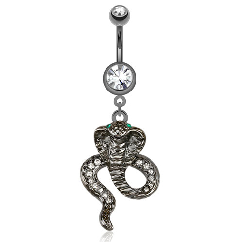 What does a cobra say? Ssssssss... This beautiful snake has a real cobra's snaky shape and incredible details. The head of the cobra has a spectacular 3D effect, even on the back. The rest of the back of the body is covered with tiny clear stones. The eyes are also crystal stones but in turquoise color. It's an incredible belly ring.