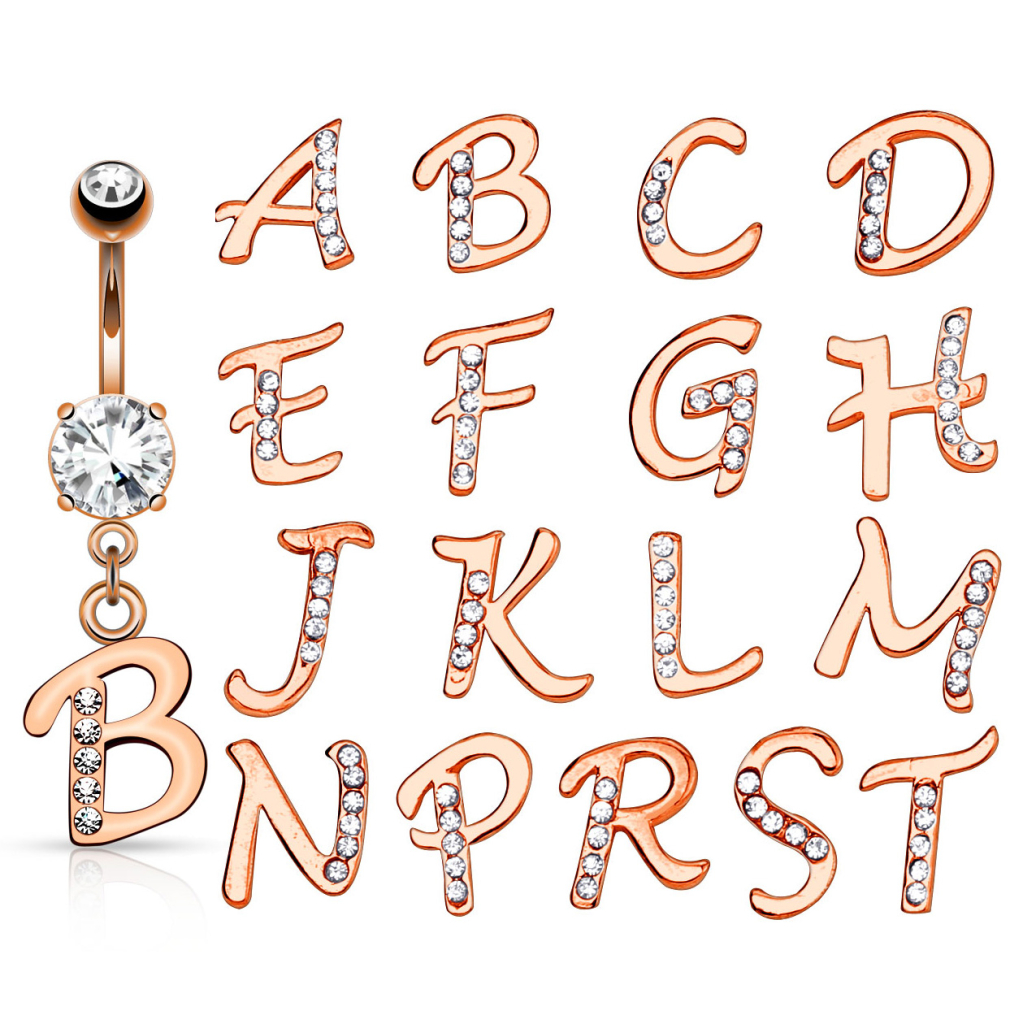 The curved barbell is made of surgical steel, and the letters are crafted from brass. The entire belly ring is plated in 14-karat gold in different colors depending on the option you pick. For example, the rose gold model is plated with 14k rose gold.