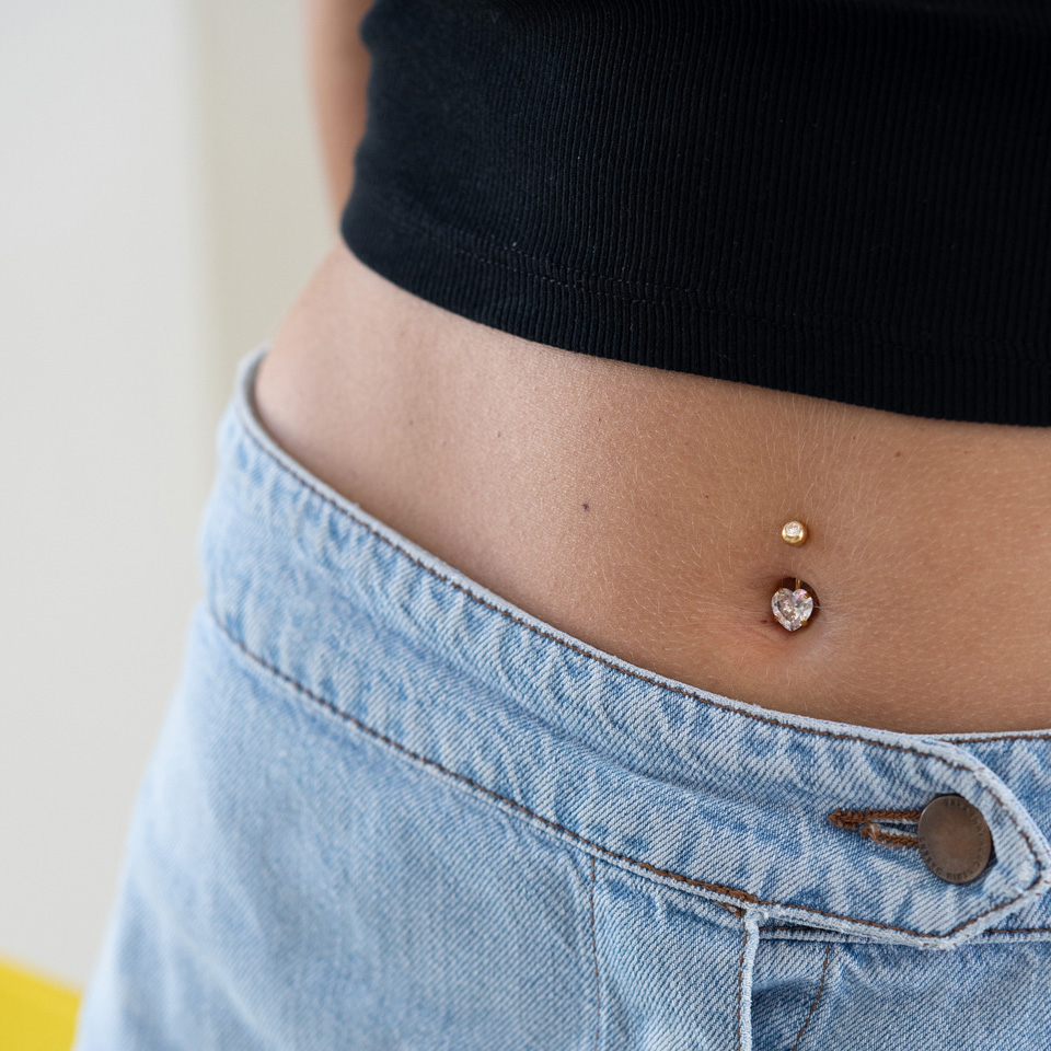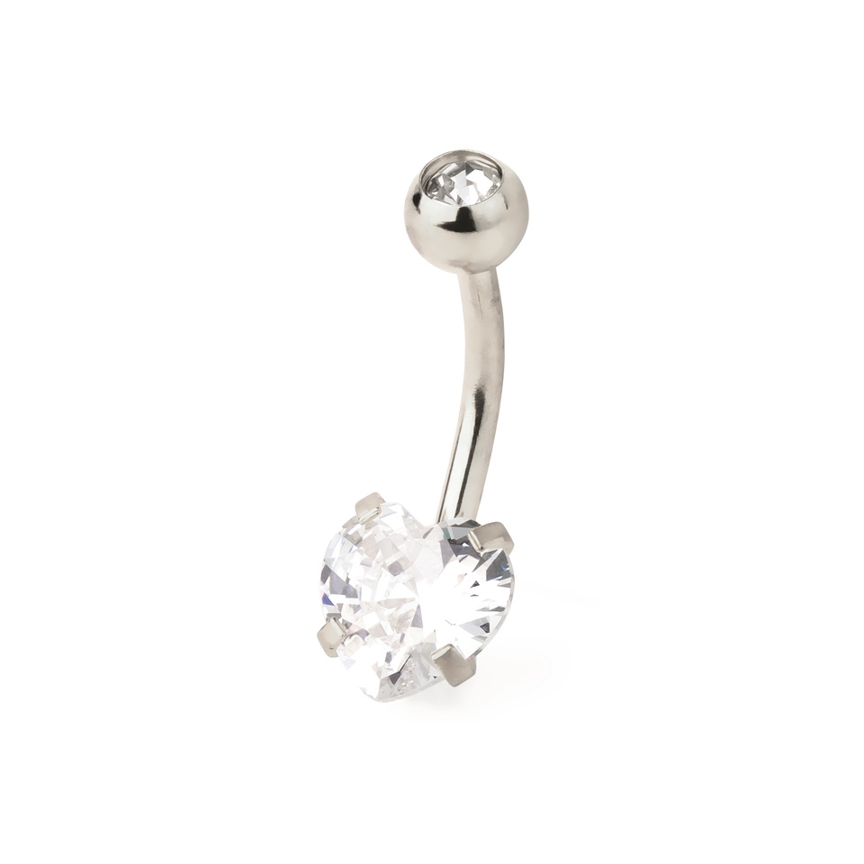 Heart shapes are a popular design within piercings, as it’s a very versatile figure that works well in jewelry in general. This time, the heart takes its shape through a carved stone, which you can find in the picture further up this page. The heart-shaped gem at the bottom is not the only stone this piece features. There is also a bezel-set clear stone on the top, which is a perfect match to the bottom stone.