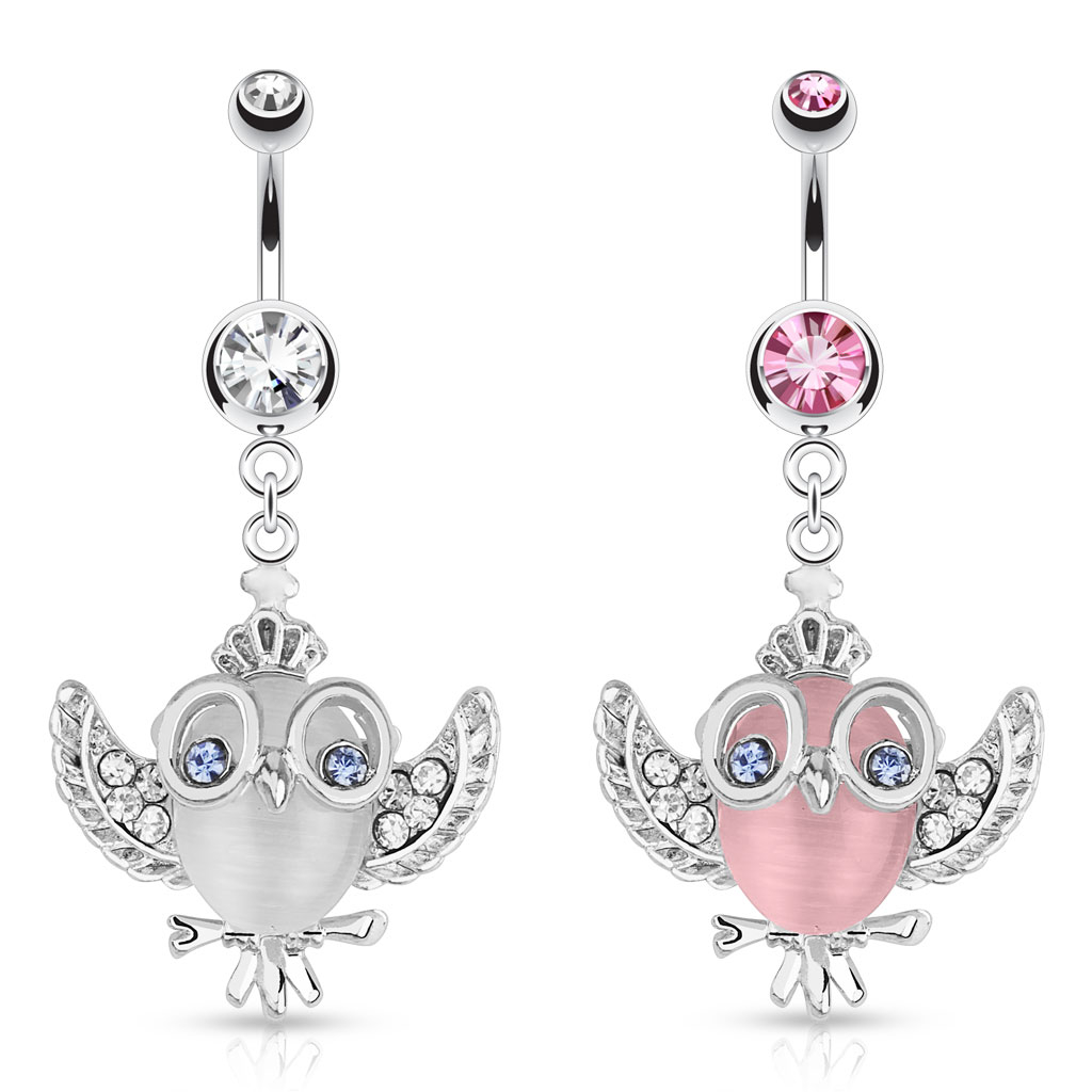 You won't find anything sweeter and more delicate than this belly button ring with an owl dangle. It's made of surgical steel, and it has a standard barbell of 3/8" (10 mm) in length. The top and bottom balls are decorated with beautiful stones in the color of your choice.