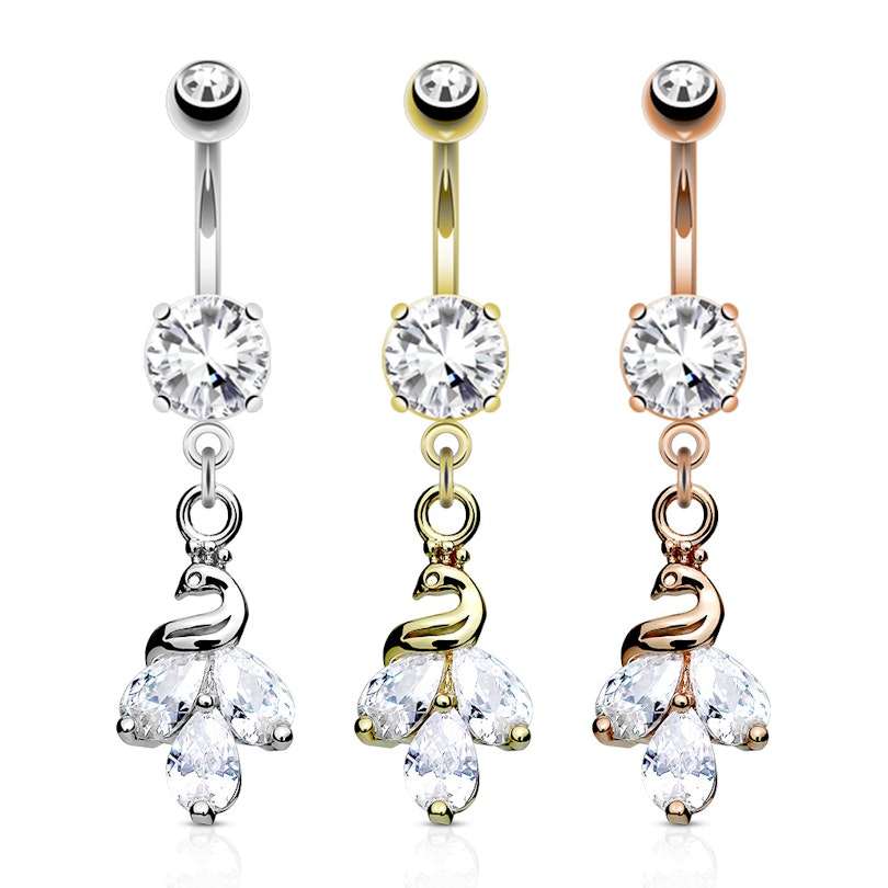 The featured peacock in this belly ring is a bit more discreet. Its feathers have been replaced with three drop-shaped clear stones, which are just as magnificent as if they were real. With this belly button ring, you’ll be ready to attract your partner ;)