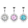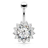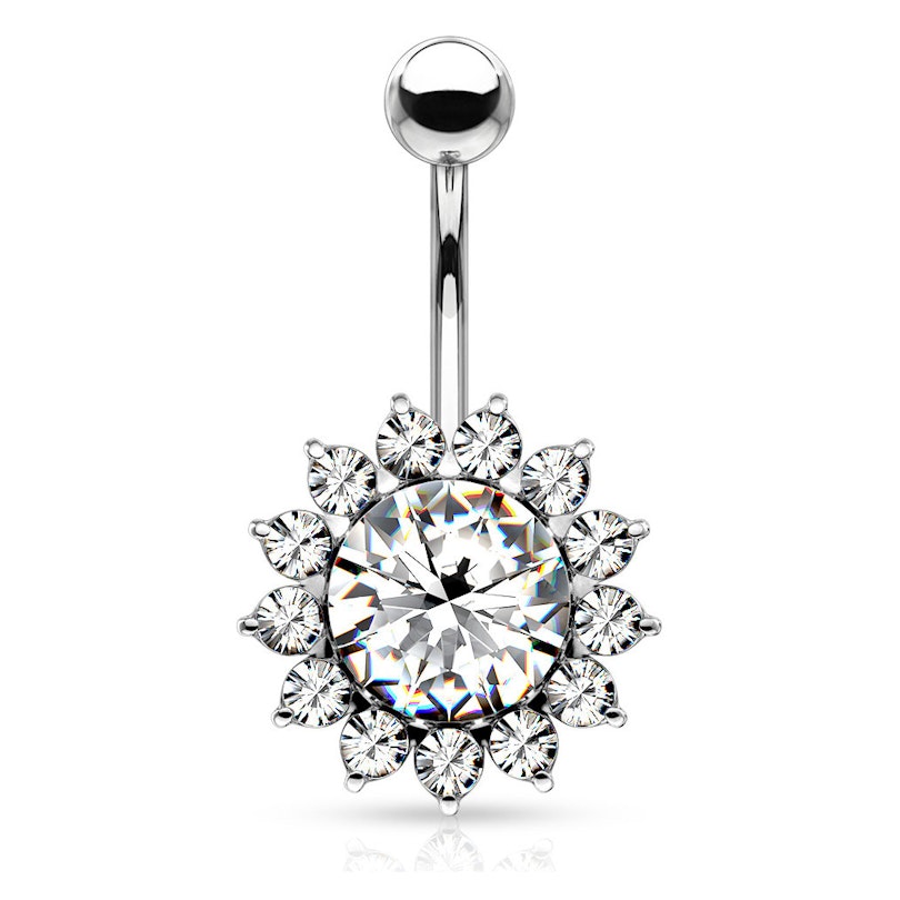 This lovely belly button ring comes with a large gem at the bottom of the curved barbell, which is very bright due to its big size. Surrounding the entire edge of this beautiful round gem, there are some smaller clear stones representing the petals of the sunflower. This jewelry reminds of a fantastic sunflower, but with dreamy colors.