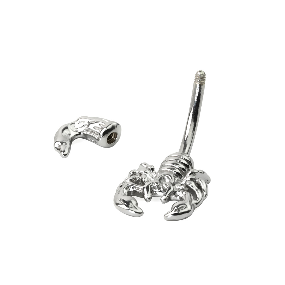 This belly button ring doesn't have a dangle or any loose part, so it's perfect to wear every day. It has a beautiful and detailed scorpion that consists of two joined parts that form a fantastic animal. The scorpion's body, head, claws, abdomen, and legs, are where you usually find the bottom ball; while the sting, in attack position, is placed over the belly button, where the top ball would usually be. As you can see, it's an excellent replica of a real scorpion, and when you join the two parts in your belly button piercing, you will see the animal completely.