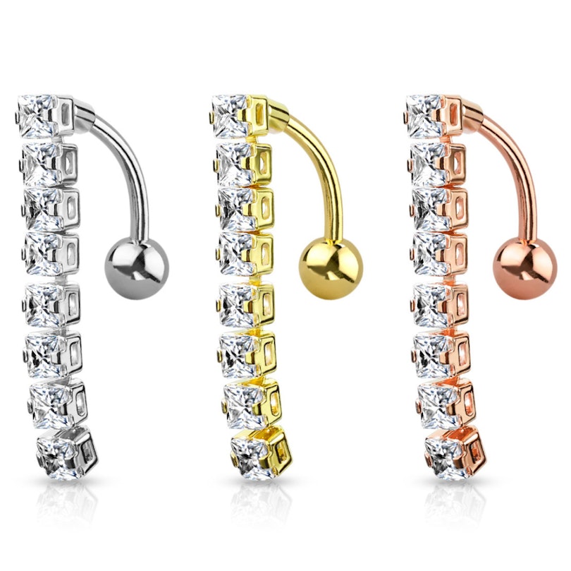 You can choose this model in one of three beautiful colors, which are a glossy silver color and two golden models, respectively. Regardless of the color that you select, the curved barbell is 3/8" (10 mm) long and features 8 square stones that hang next to each other in a pendant.
