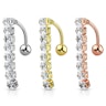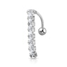 The piece of jewelry you can see above consists of a curved barbell made of surgical steel. At the bottom sits what would have been a top ball in a regular belly ring. However, since this is a reverse belly ring, the top ball is placed at the bottom. The pendant, which is usually placed at the bottom, is at the top. That makes it ideal for you if your piercing is in the lower part of the navel. However, you can also use it in a regular belly button piercing; in that case, the stones will stick out from above the navel and cover the barbell, the ball, and the belly button.