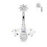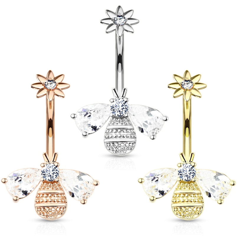A belly button ring doesn't have to consist of a top ball and a slightly larger bottom ball. It can also be, as in this case, a more creative piece with something extra in the design. The top ball is not only internally threaded, but it also features a flower-shaped screw-on ball with a small stone in the center. The flower is screwed into the 3/8" (10 mm) curved bar. At the end of the bar is a little bee with two beautiful wings of stone. The head of the bee is also made of stone. The body includes some details that make the bee look more lifelike.