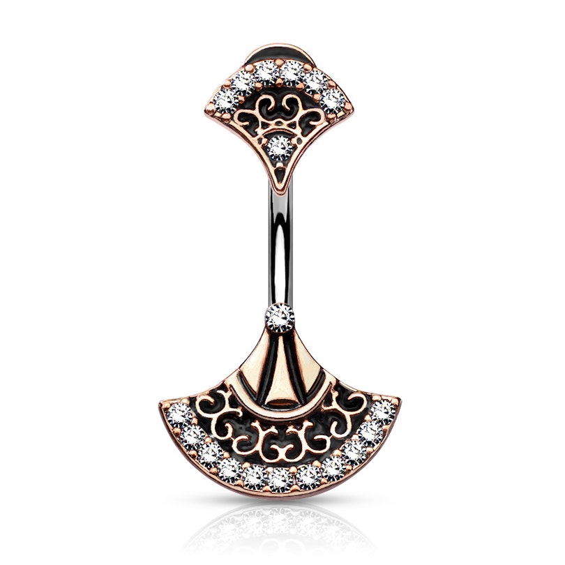 This is an elegant piece of jewelry for your belly piercing. It has a bit of it all: small cute scroll decoration, stones, and beautiful symmetry. The overall look with small clear stones is really elegant. The stones sit on opposite sides of a 3/8" (10 mm) long curved bar. The top of the belly ring includes a fan-shaped part with a total of 7 stones, while the bottom part has a larger fan with as many as 12 stones.