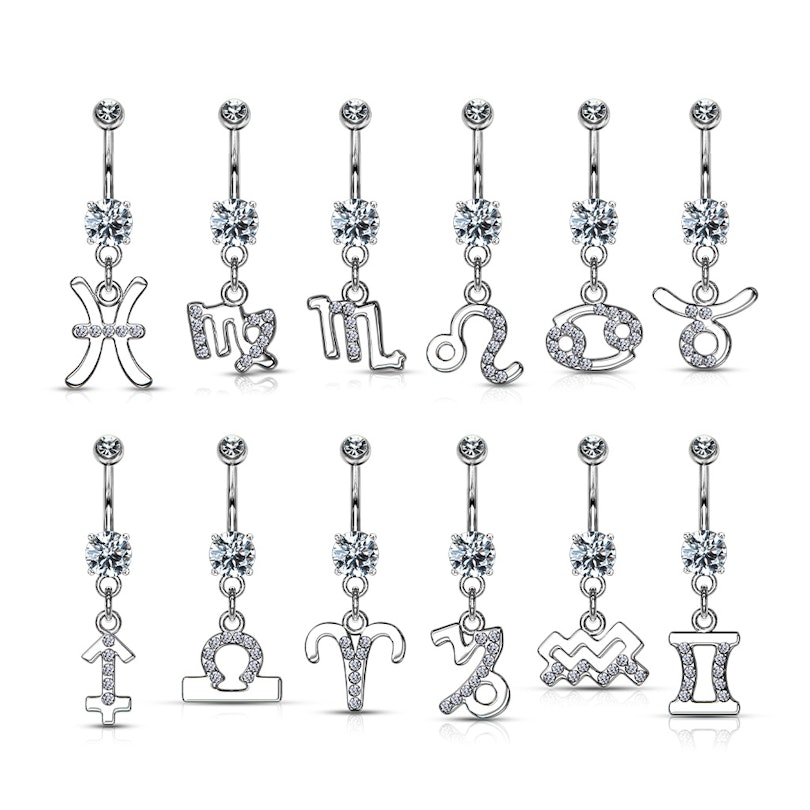 Get a fabulous belly button ring with your zodiac sign dangle. You can choose your sign or your favorite person's. All of them are decorated with beautiful clear stones. Select your sign from the drop-down menu above.