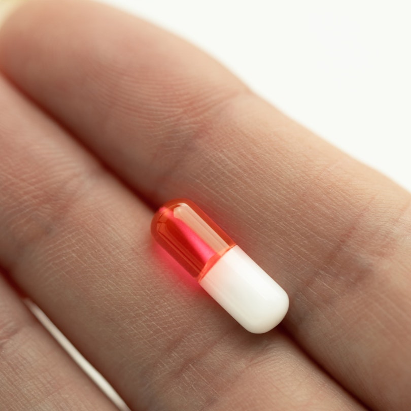 The size of the bicolor capsule is inspired by real capsules of 5/8" (16 mm) in length and a thickness of 3/16" (5 mm). However, it has little to do with regular medicines. This original capsule is available in seven different color combinations. One half of the pill is white in all the models, while you can choose the color of the other half from the drop-down menu on the right of the picture.