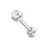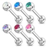 This tongue barbell is like regular barbells, except that it comes with a specially beautiful and large top ball that features a synthetic opal stone. The opal is securely bezel-set in the ball so that the metal surrounds it. The opal can lie loose in the ball but it won't fall out.