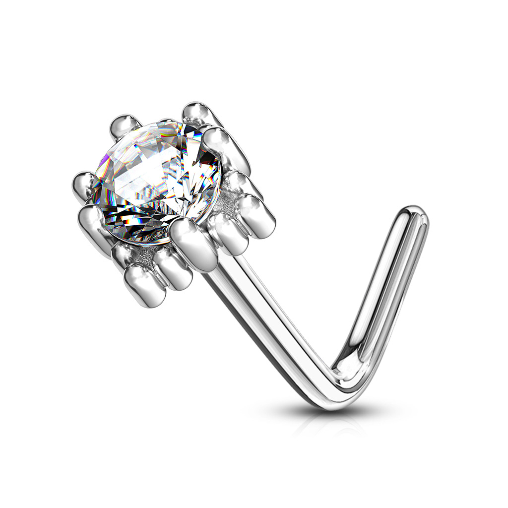 This nose ring made of solid 14-karat gold features the most beautiful gem on the top. This gem sits on a square shape, held in place by a prong-setting to ensure it won’t come off.