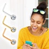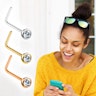 This fabulous jewelry is an L-shaped pin, a type of stud between a regular nose stud and a nose screw. It needs a little patience to put it in your piercing, but it fits snugly. This jewelry has the best features of the two types of studs because it's easy to put in and out, and thanks to its design, it perfectly fits your nose piercing without the risk of slipping out.