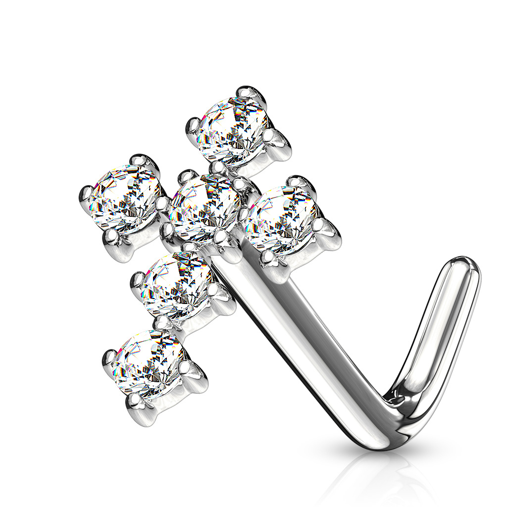 As you can see in the picture, there is a cross on top of the stud, made up of 6 gems merged on it. The stones are cubic-shaped zirconia, and they always come in transparent color, regardless of the color of the barbell. The cross is 0.23" (5.8 mm) in height and 0.17" (4.3 mm) in width.