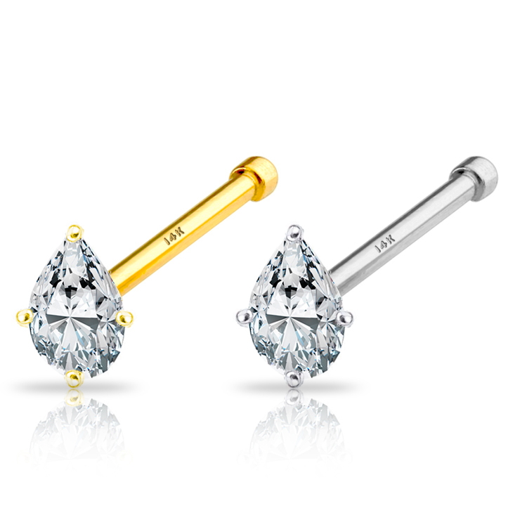 This small and sweet nose stud is made of 14-karat gold. The bar has a length of 1/4" (6 mm) and has a stone on top. The stone has the shape of a drop, or a teardrop, held by a four-prong setting. On the opposite end of the bar, there's a small ball that keeps the stud in place. It's small enough to push it into the piercing but big enough to prevent it from slipping out.