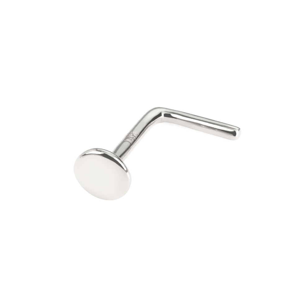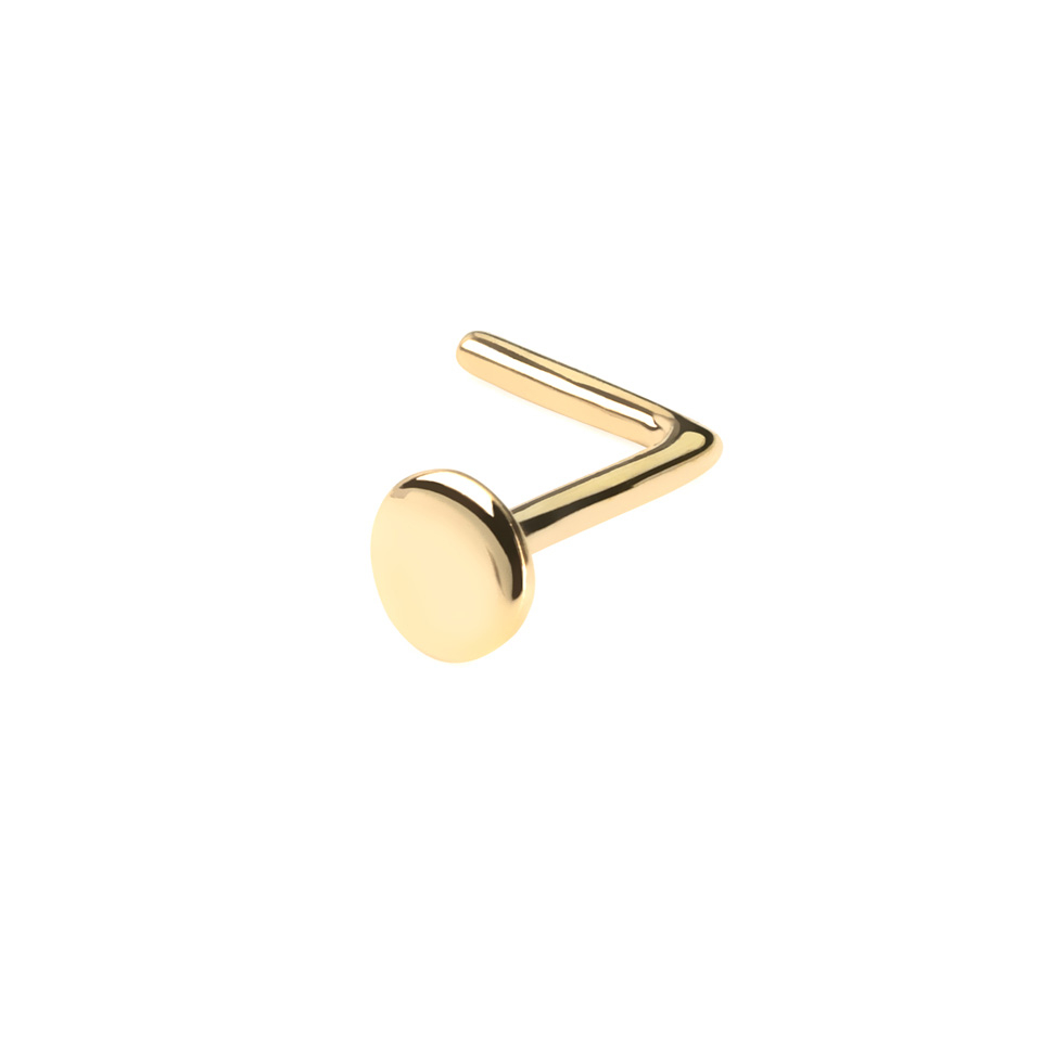 In the picture above you can see a fabulous nose ring, made of 14-karat gold. Nose studs can be elegant besides simple; this ring is a good example of it. You can choose from two different versions: in 14-karat classic gold or in 14-karat white gold. It features a flat circular top that ensures that the stud stays in place. The top has a diameter of 1/8" (3 mm), so it's a discreet L-shaped nose stud.