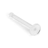 This nose piercing retainer is made of transparent plastic or Bioflex, and it consists of a single bar with a gauge of 20 (0.8 mm) and a length of about 1/4" (7 mm). It has a small ball on one edge, slightly thicker than the bar. This works as a stop, so it will not get out of the nose if used normally. On the other edge, it has a plate with a diameter of 1/16" (2 mm), which should be placed inside the nose.