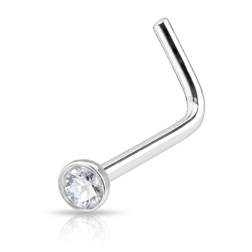The design of this nose stud is between a nose screw and a regular stud. It fits your nostril perfectly thanks to an L-shaped stud 1/4" (6 mm) away from the top. It's available in two different gauge sizes so that you can choose the one that suits your piercing.
