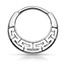 This septum clicker holds a pattern that looks like a labyrinth or a Greek border along the ring from side to side. The hoop is slightly wider in the center than in the edges, giving it a harmonious finish.