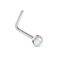 When this stud is in your nose piercing, you can't see the color of the stud, but only the part that frames the opal stone. The stud is L-shaped, bent from the middle at a straight 90-degree angle, and easy to put in and take out.