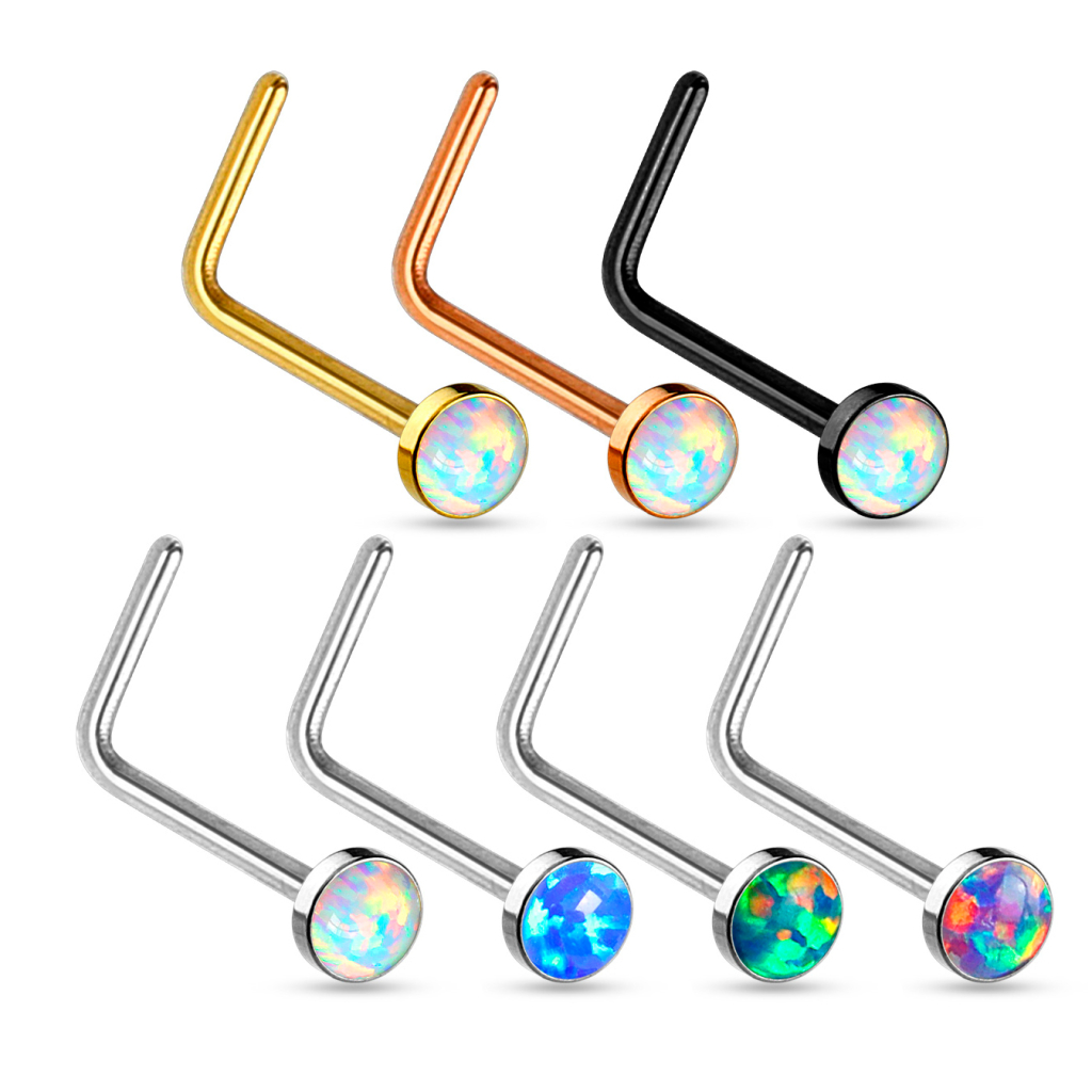 When this stud is in your nose piercing, you can't see the color of the stud, but only the part that frames the opal stone. The stud is L-shaped, bent from the middle at a straight 90-degree angle, and easy to put in and take out.